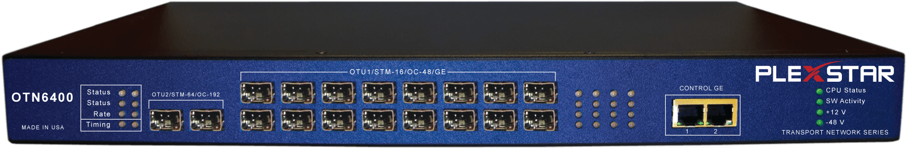 The Plexstar OTN6400 is a very high capacity multi-service fabric-based platform capable of centralized switching of any combination of SONET/SDH, OTN, or packet traffic in a compact 1U chassis. The OTN6400 supports up to 16 SFP client ports where any port can be configured to transport a variety of clients, including OC-3/12/48, STM-1/4/16, OTU1, FE, GE, ESCON, FICON, FC-12/25/50/100/200/400, or any bit transparent client. The OTN6400 will also simultaneously support two high-speed client ports, where either port can independently be configured for OC-192, STM-64, 10GE LAN, 10GE WAN, 8G FC, 10G FC.
