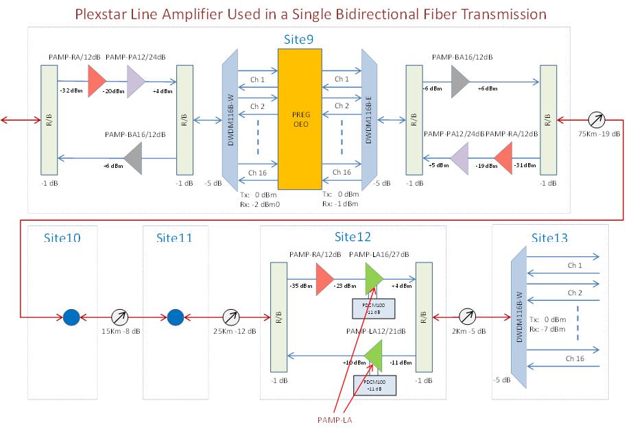 Plexstar PAMP-LA-12/19, PAMP-LA-12/21, PAMP-LA-12/23, PAMP-LA-16/21, PAMP-LA-16/25, PAMP-LA-16/26, PAMP-LA-16/27, and PAMP-LA-16/28 are low profile ultra-light optical line amplifiers those amplify optical signals directly without the need to first converting them to separate electrical signals. These EDFAs are designed with dual-stage pump laser and internal Gain Flattening Filter (GFF) to compensate the Erbium fiber gain variation. These are typically used as an intermediate point in the network to increase DWDM channel power levels.
